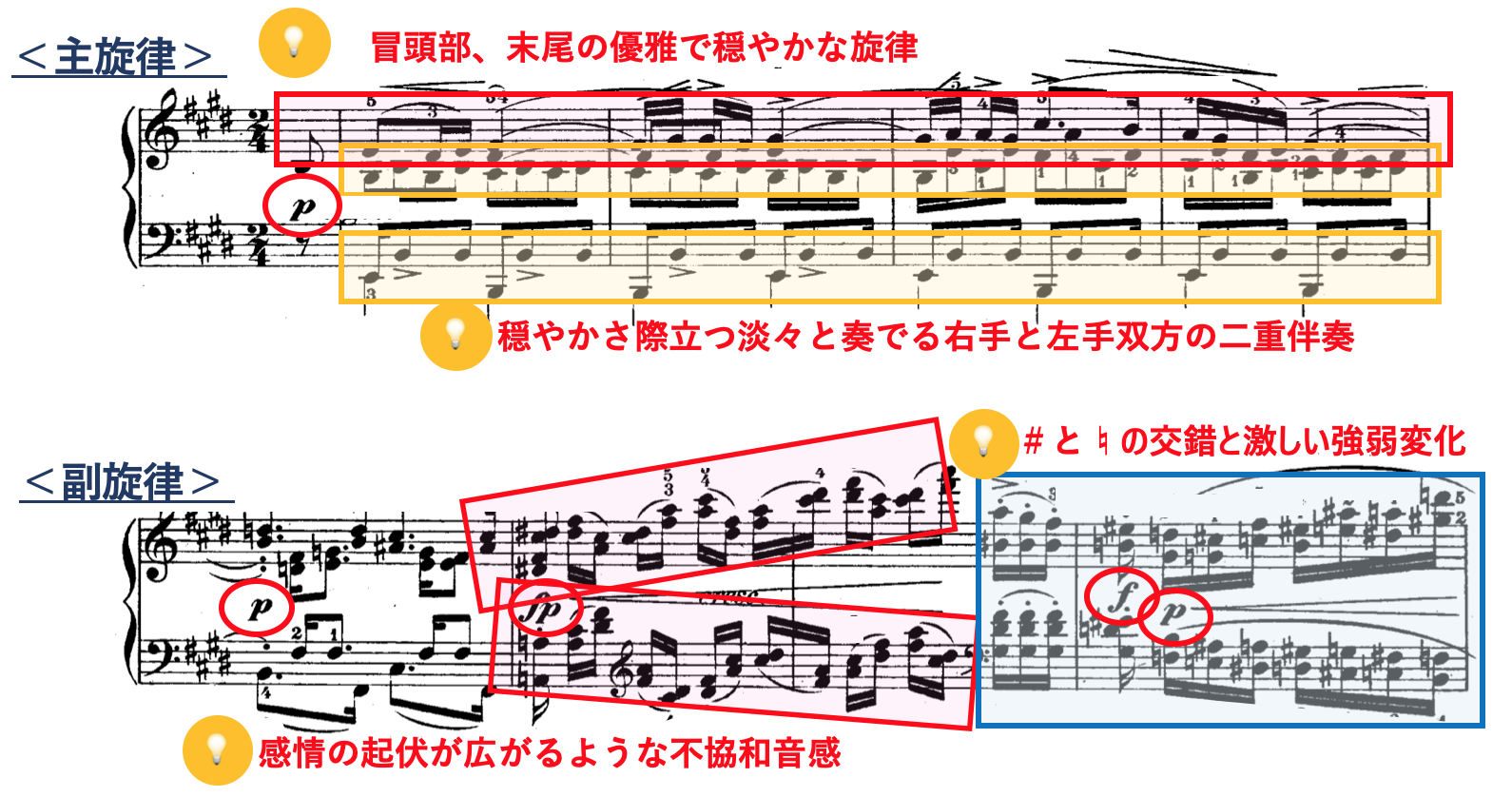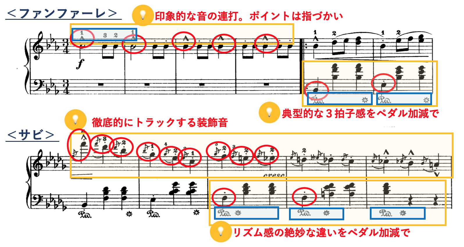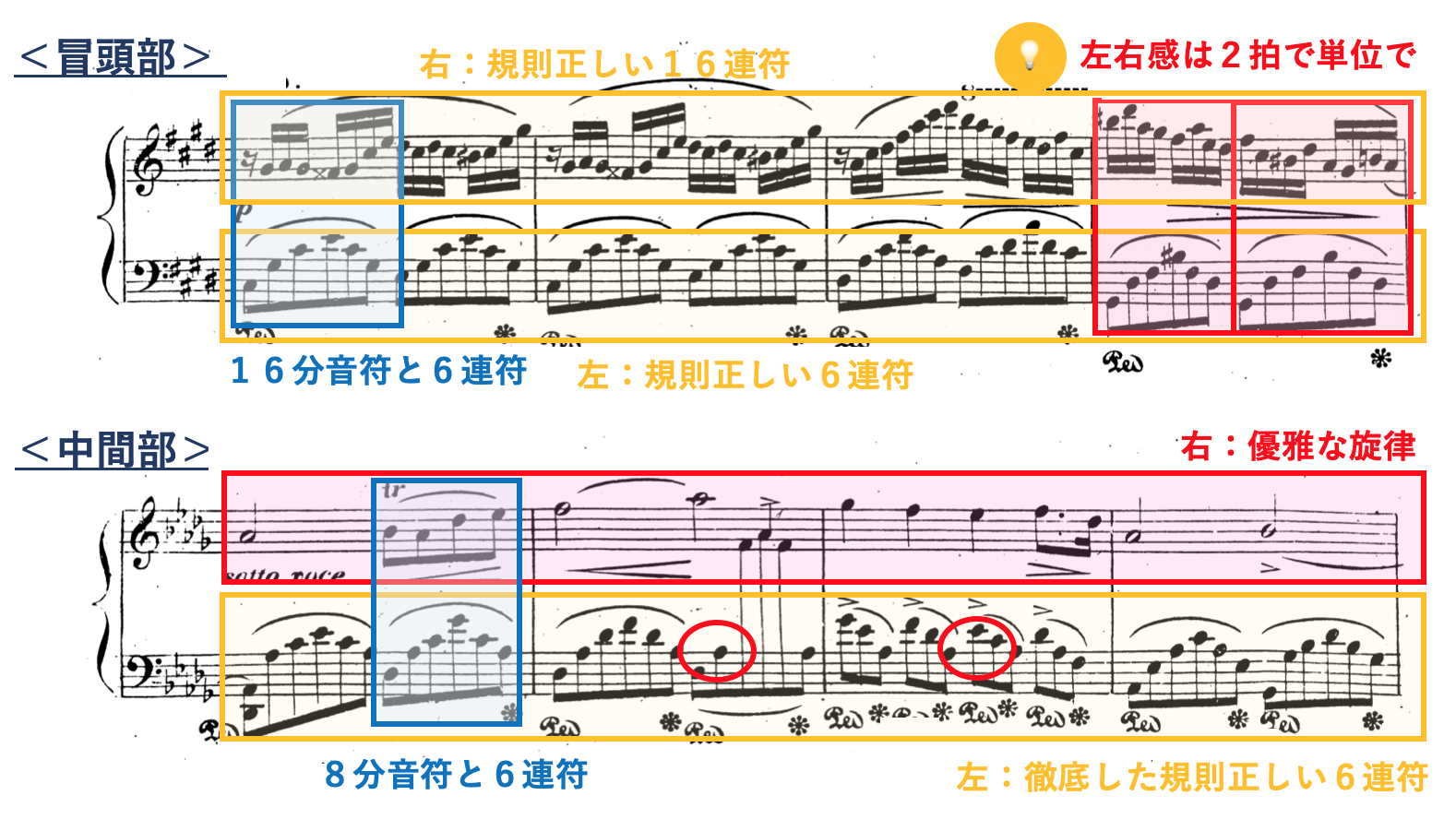 ・感情表現は右手のリズムや装飾の変化を強調