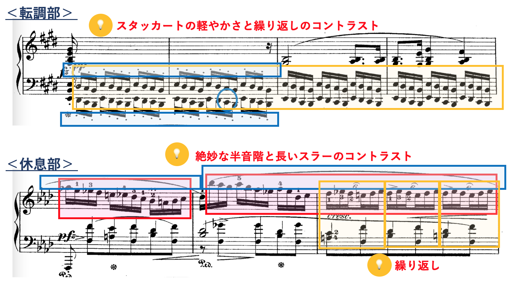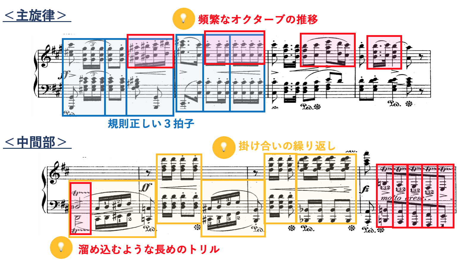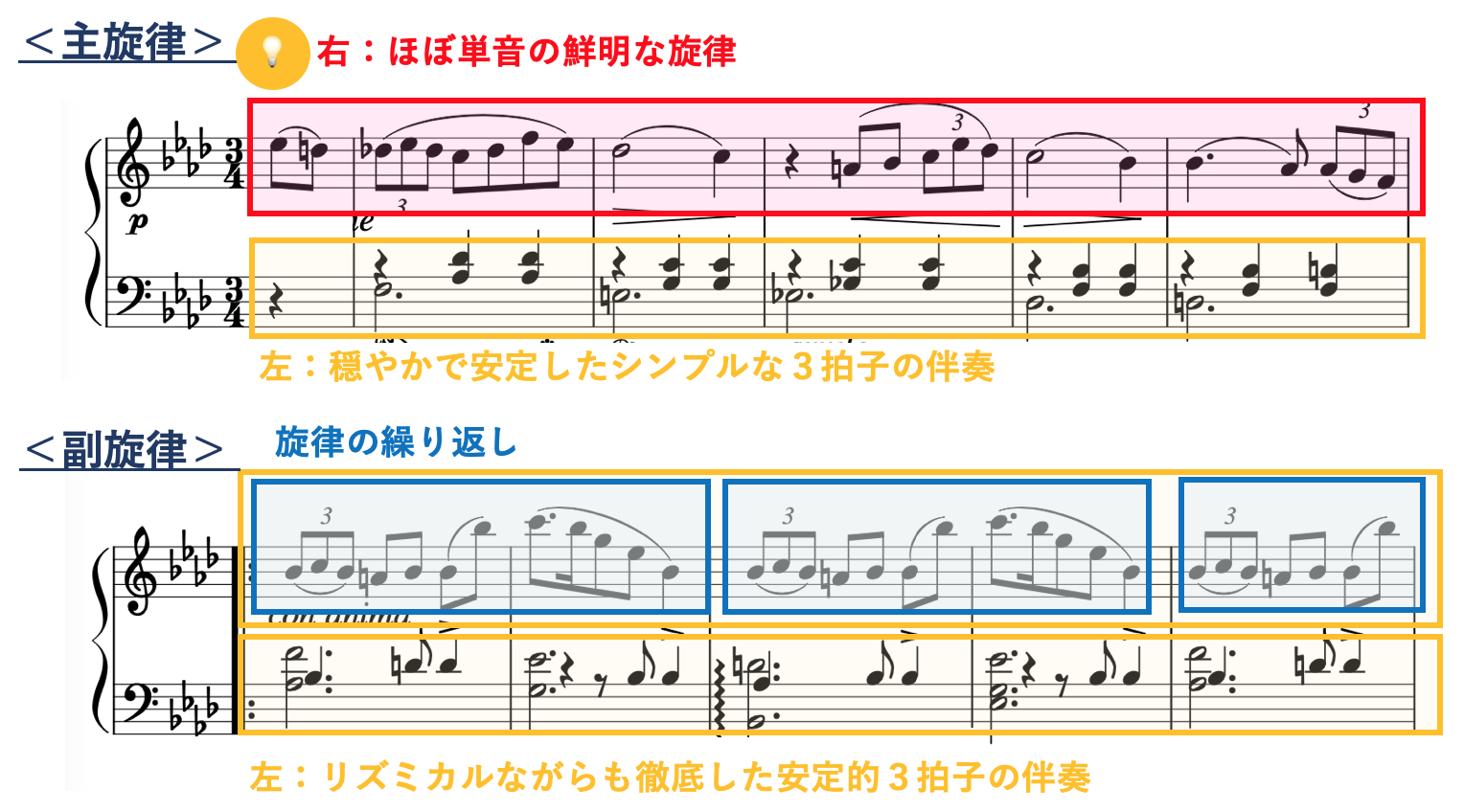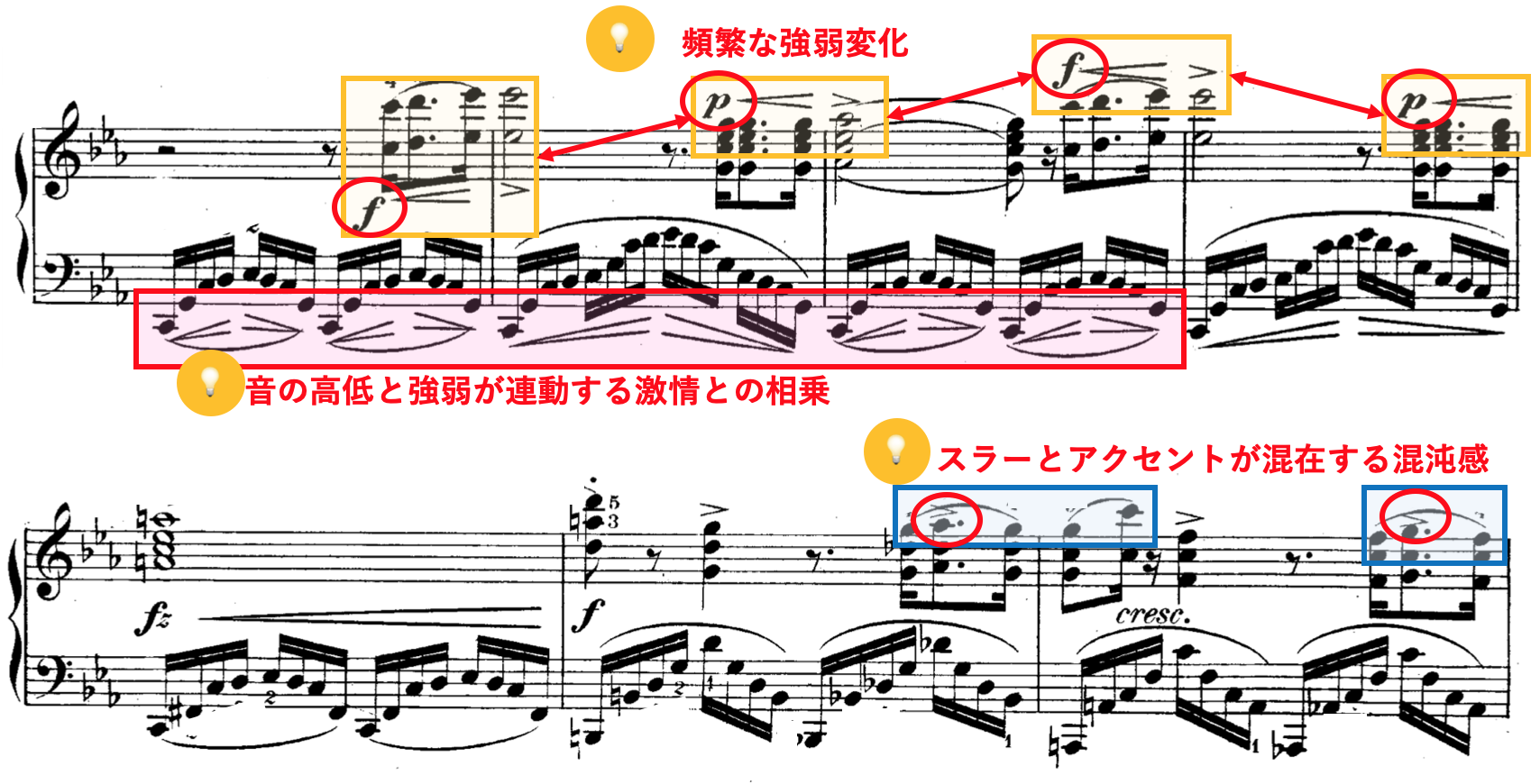 ・感情表現は右手のリズムや装飾の変化を強調