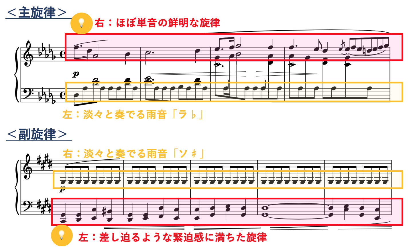 ・副旋律部のメインは左手の音推移、繰り返すメロディに増す音に緊迫感を乗せて