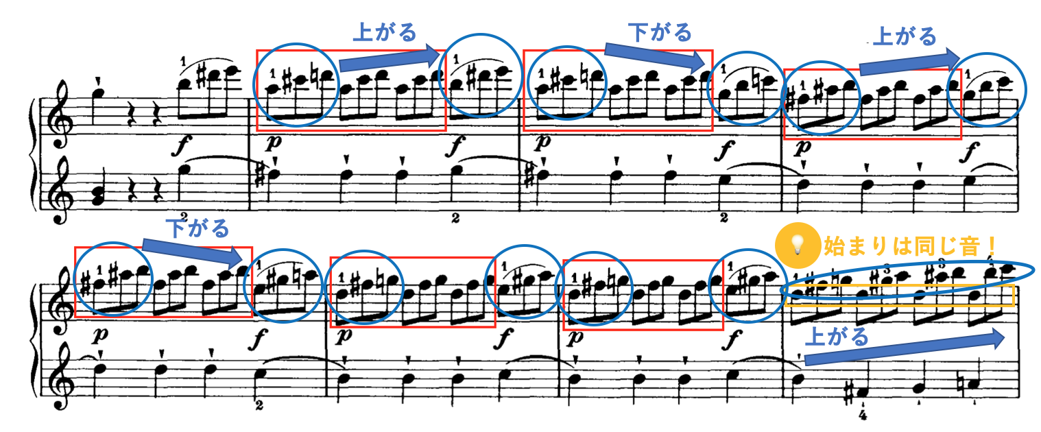 すんなり弾けない箇所の特徴にはいくつか傾向がありますが、一概に音運びの変化が盛んな場合に起こりがちです。