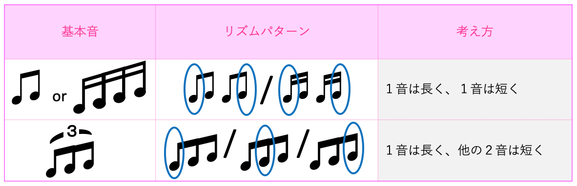 従って、音の変化を強調するリズムパターンで練習することにより、力まず淡々と奏でることができるようになります。
