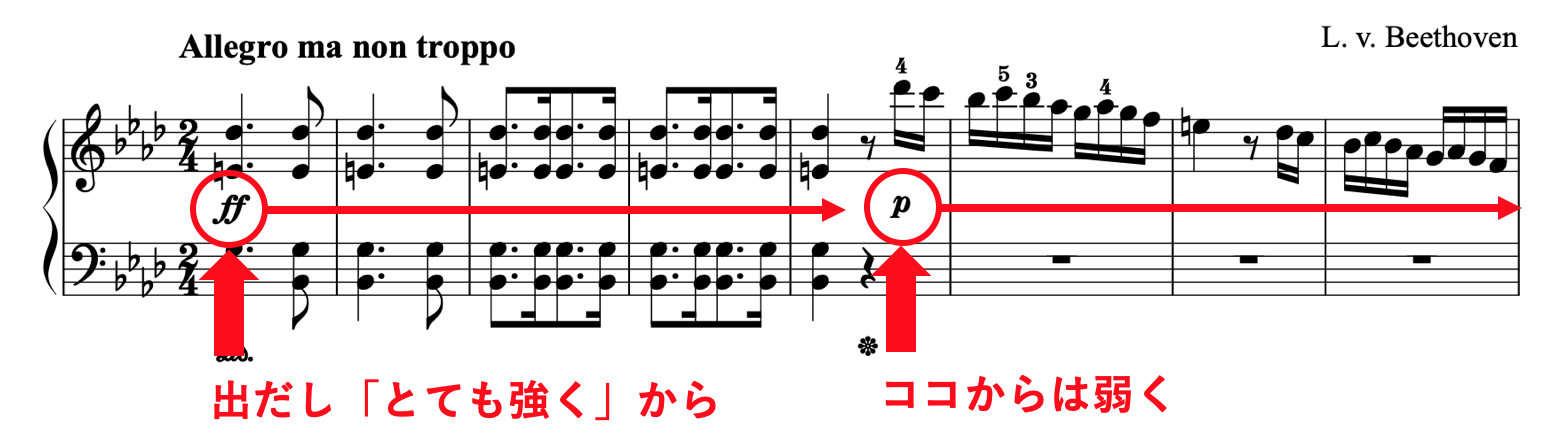 ※source: ベートーベンピアノソナタ作品13(悲愴)第1楽章(https://www.ongakunoohanasi.com/free-scores/beethoven.html)
