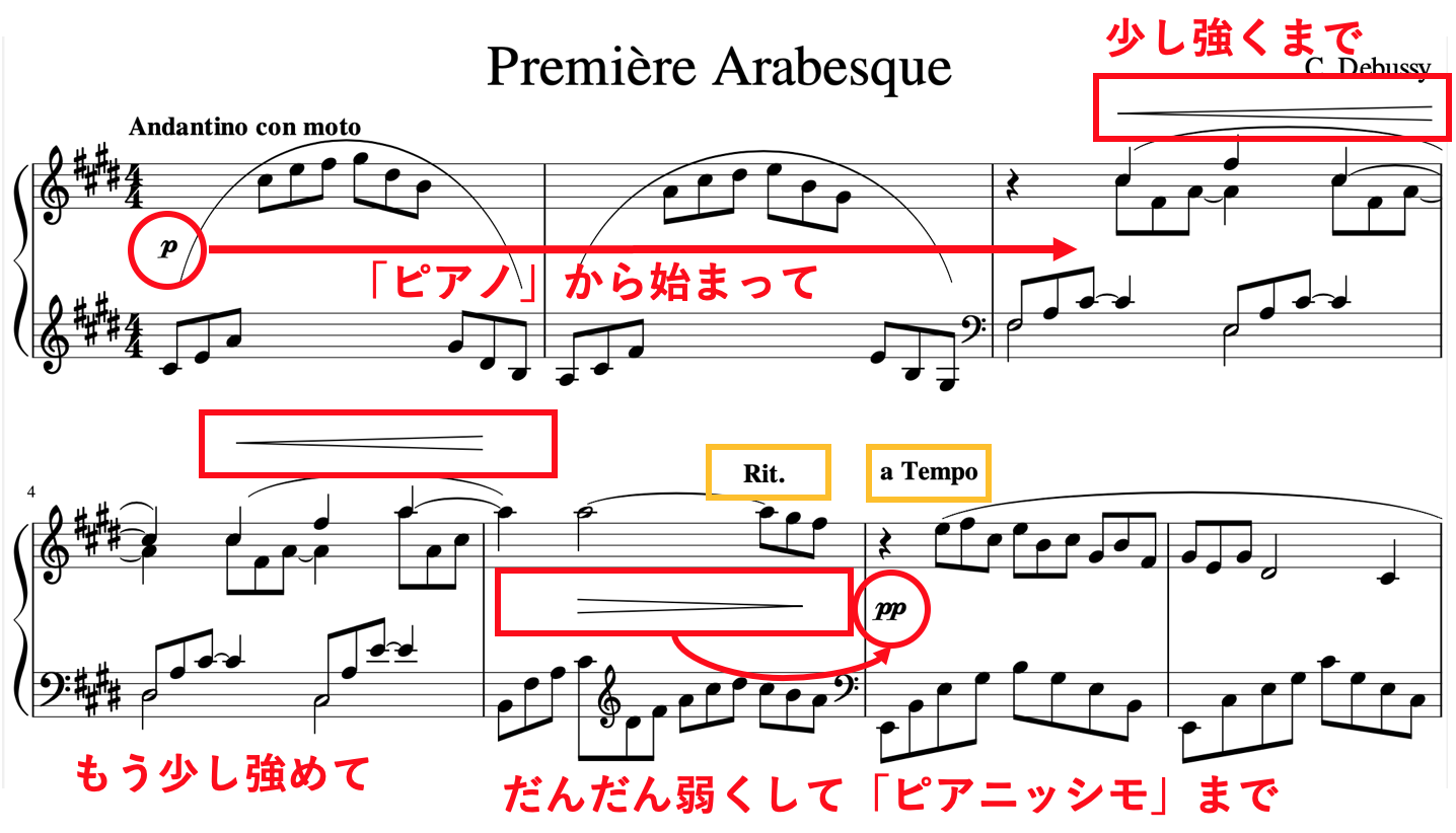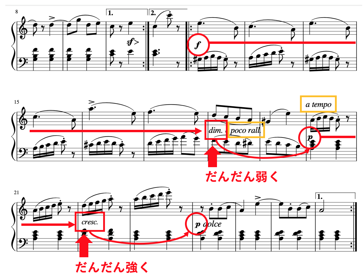 ざっくり、フォルテ(f)が重なるほど音の強さへの想いは増し、ピアノ(p)が重なるほど音の弱さを強調する演奏が示唆されます。