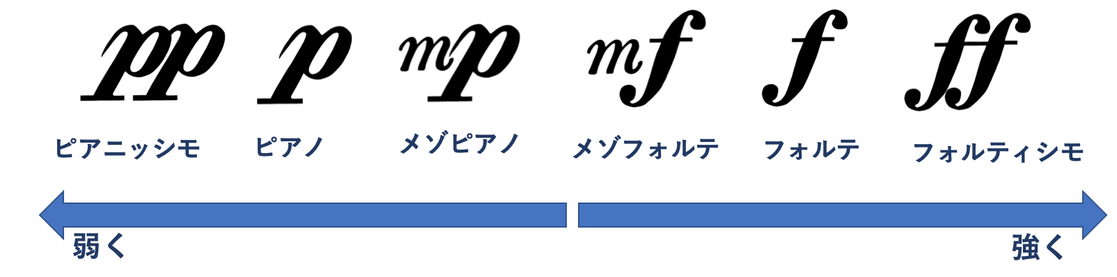・かなりの強弱:2つ重ねる。かなり強くはフォルティシモ(ff)、かなり弱くはピアニッシモ(pp)