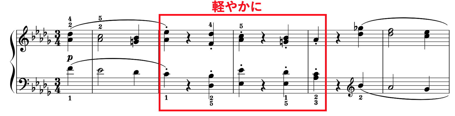 スタッカートの例:音に「・」の表記。サラッと軽やかに