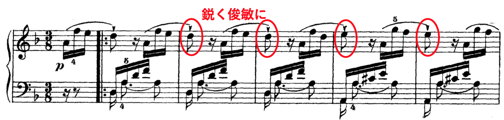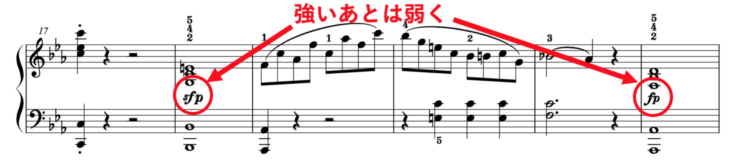 フォルテピアノの例:強くした後に弱く。その急激な強弱変化を強調する表現