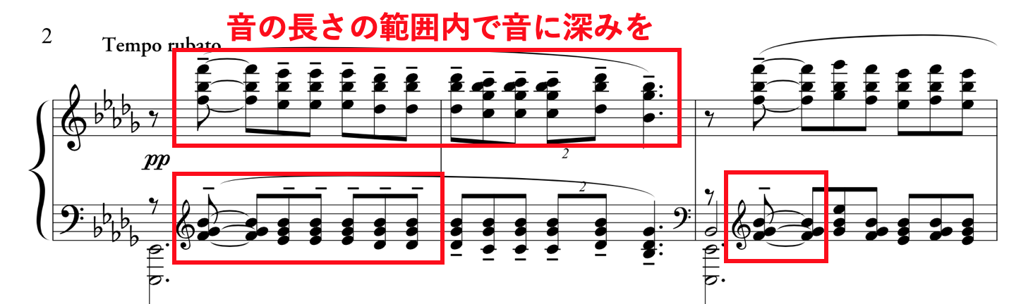 まず、余韻を残す音とは、鍵盤をしっかり底まで堪能することで、貯めるように弾くことができる技法です。