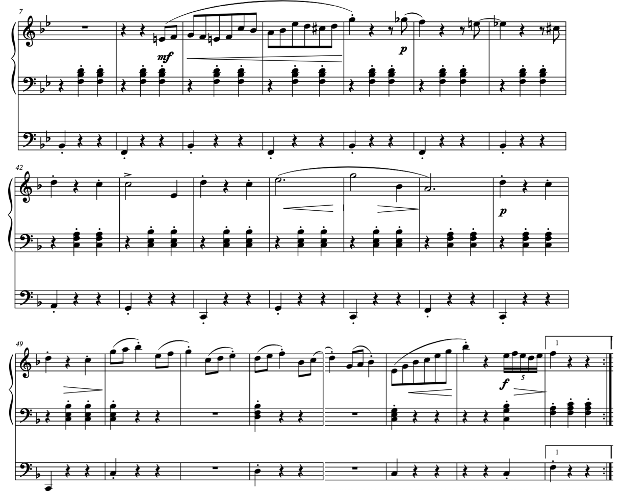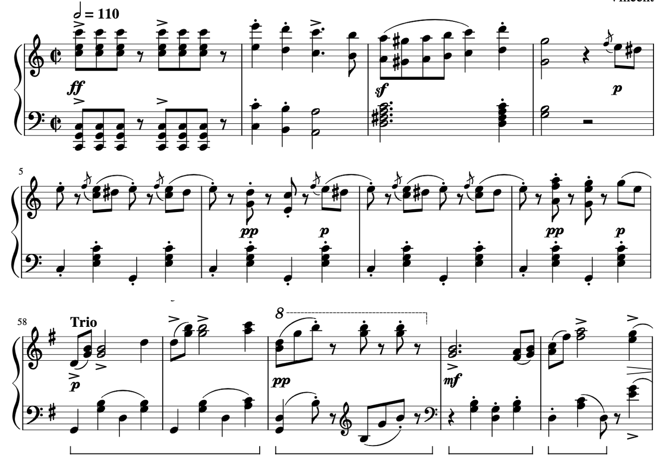 軽快に拍を刻むハ長調のピアノ曲でありながら、そのままオーケストラ演奏になりそうな音運びですよね。