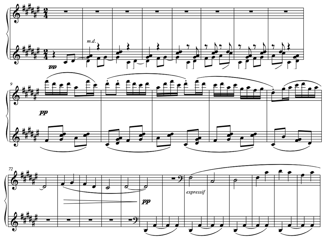 中間部、上の楽譜の3段目では、ほぼ単音ながら、シンコペーションのような構成で、夢見心地で泉に佇むような箇所を挟みます。