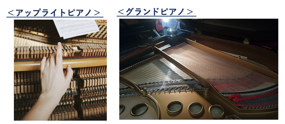 ・アップライトピアノ(縦ピアノ):弦が上下に張ってあり、対面で音が響くイメージ