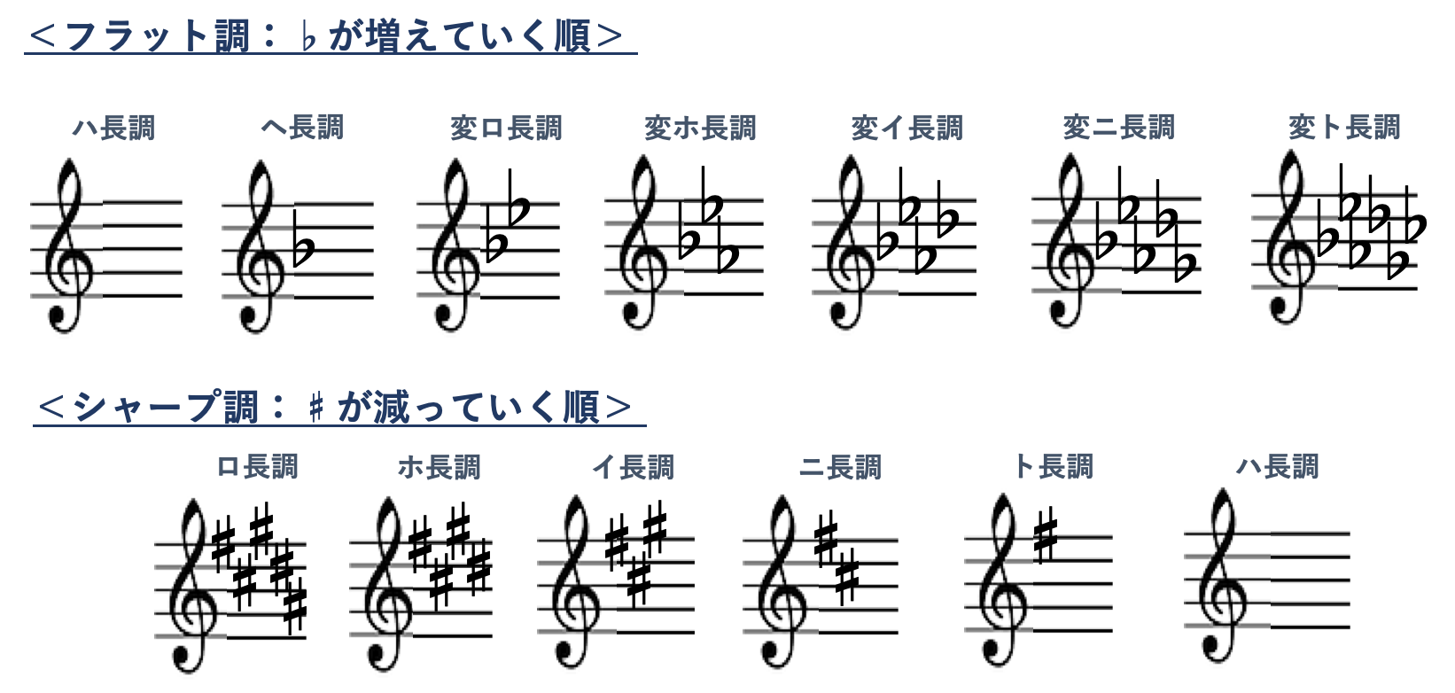 (※)調号の仕組みについては「ピアノ調号の覚え方:たった3つでスンナリ簡単!音階の法則」「ピアノ調号の覚え方:シャープ音階もスンナリ!不動3ルール」で詳しく解説しています。ぜひみてみてください。