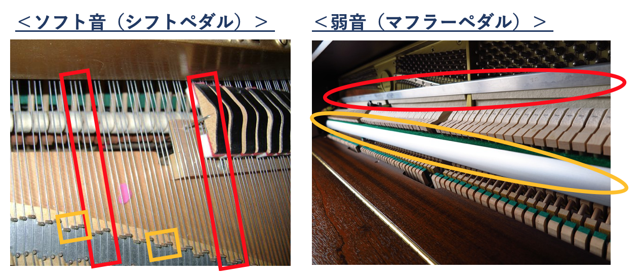 また、左側のペダル(グランドピアノは「シフトペダル」、アップライトピアノは「ソフトペダル」)は、物理的には音の振動を軽減させます。