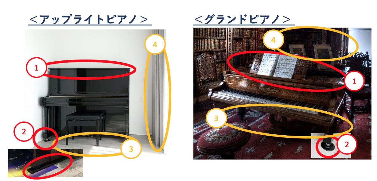つまり、ピアノの防音は、この4箇所を念頭に対策することができます。
